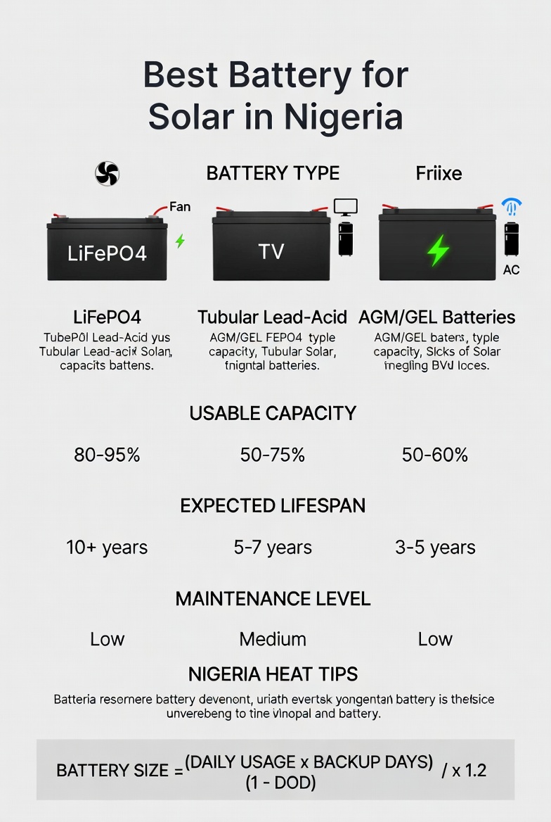 For most Nigerian homes, the best battery is LiFePO₄ (lithium iron phosphate) because it supports deep daily discharge during outages, charges faster, and lasts significantly longer when properly installed and configured.