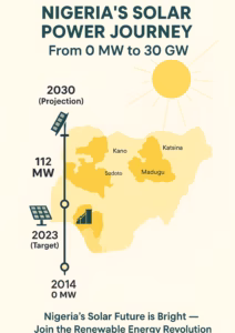 - 2030: 30 GW projection. With icons of rising sun panels and upward arrows, overlaid on a map of Nigeria highlighting high-irradiance northern states. This visual underscores the exponential growth, making it shareable on social media for SEO backlinks.